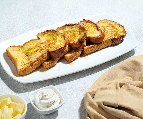 An all time classic breakfast dish made with fluffy sliced bread soaked in a sweet custard, cooked until golden brown served with maple syrup and whipped cream
